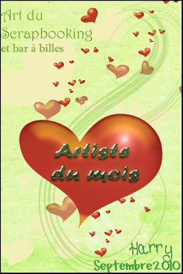 Le blog "Art du scapbooking" m'a élu Artiste du mois de Septembre.Je voudrais les remercier d'avoir pris le temps de "yeuter" mon blog et de m'avoir choisi...Mettons que ça fait ma journée...pis mon mois!!! Merci à toute l'équipe xoxo